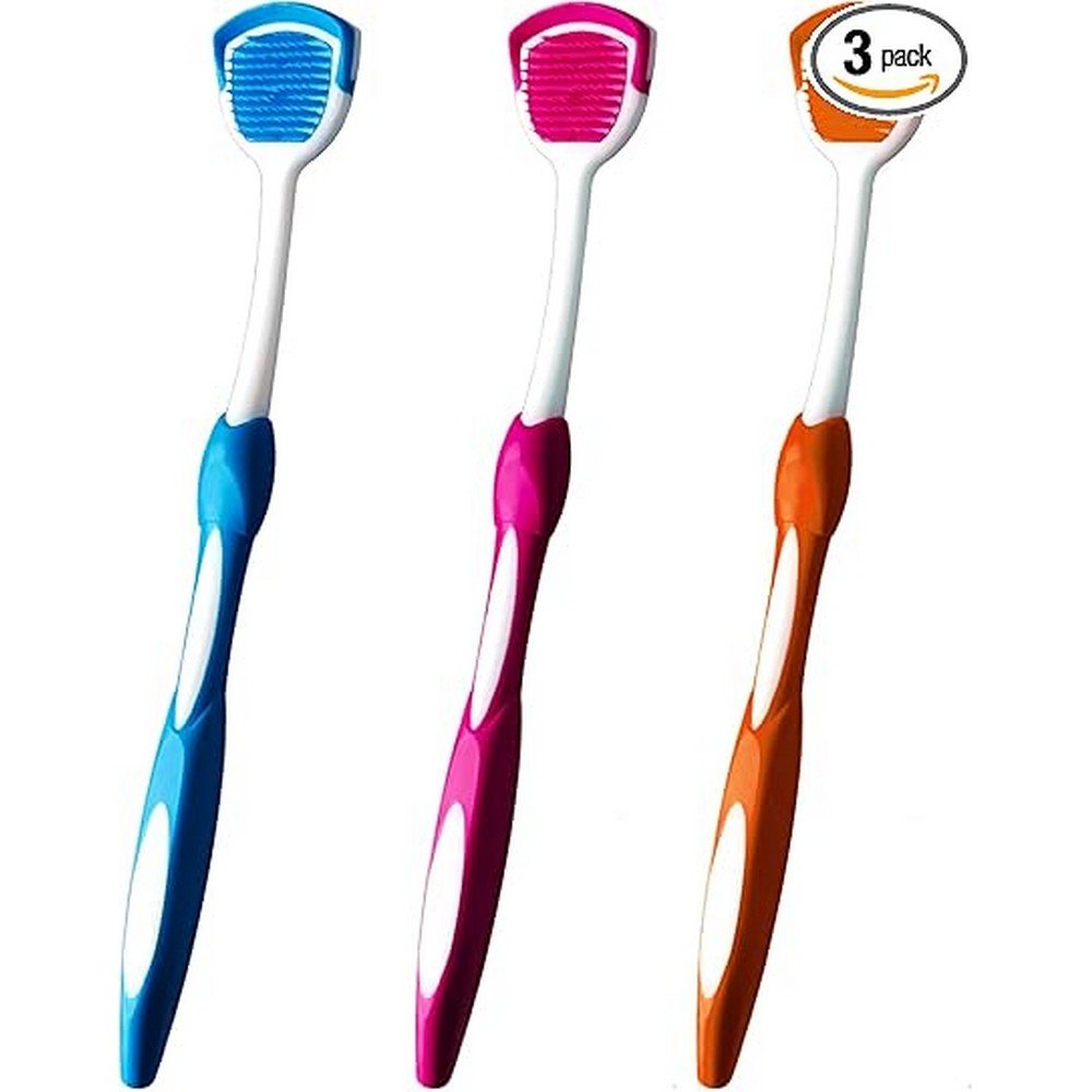 Package Contents: 3 dual‑texture tongue scrapers (blue, orange, red)