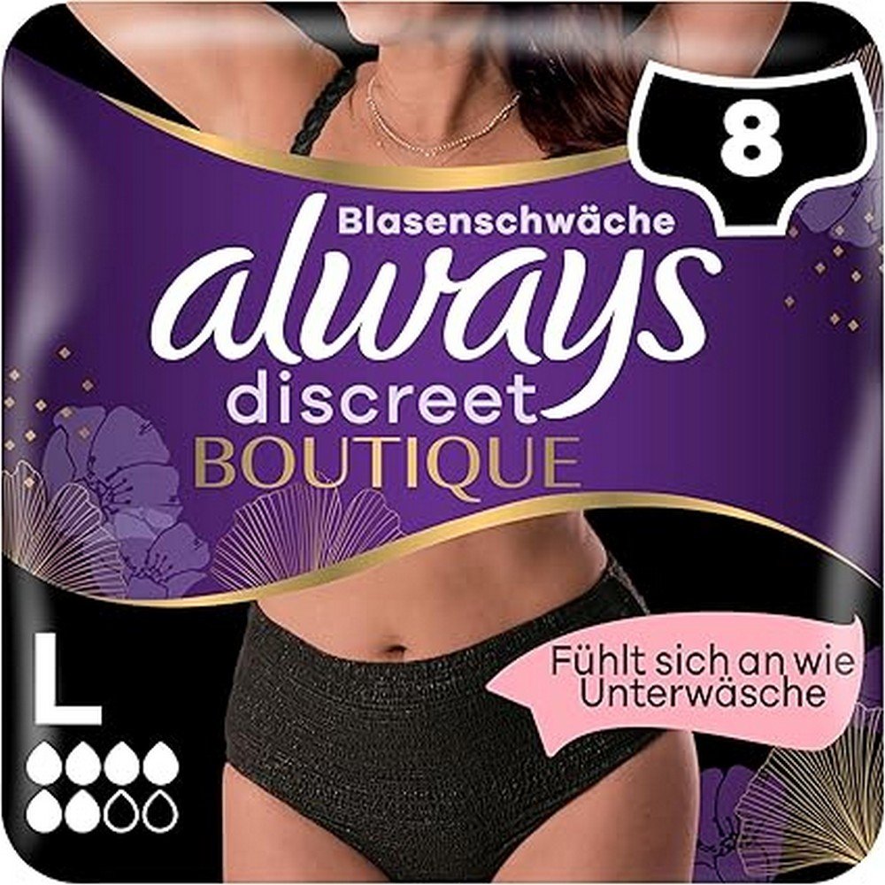Always Discreet Boutique Incontinence Panties Plus Black offer women discreet, comfortable protection against light to moderate incontinence. Designed to feel and look like regular underwear, these panties feature a super absorbent core that locks in liquids and neutralizes odours instantly. The body-hugging design ensures a comfortable and secure fit, while the soft, breathable fabric keeps skin fresh throughout the day. Ideal for daily wear, travel, or work, the pack contains 8 panties in size L, providing all-day confidence and comfort.
