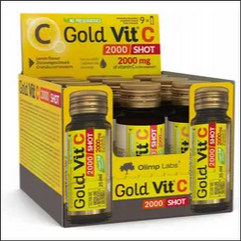 Olimp Gold Vit C 2000 Shot, vitamin C ampoule, liquid vitamin C, high dose immune support, antioxidant, lemon flavor, fatigue reduction, collagen health.